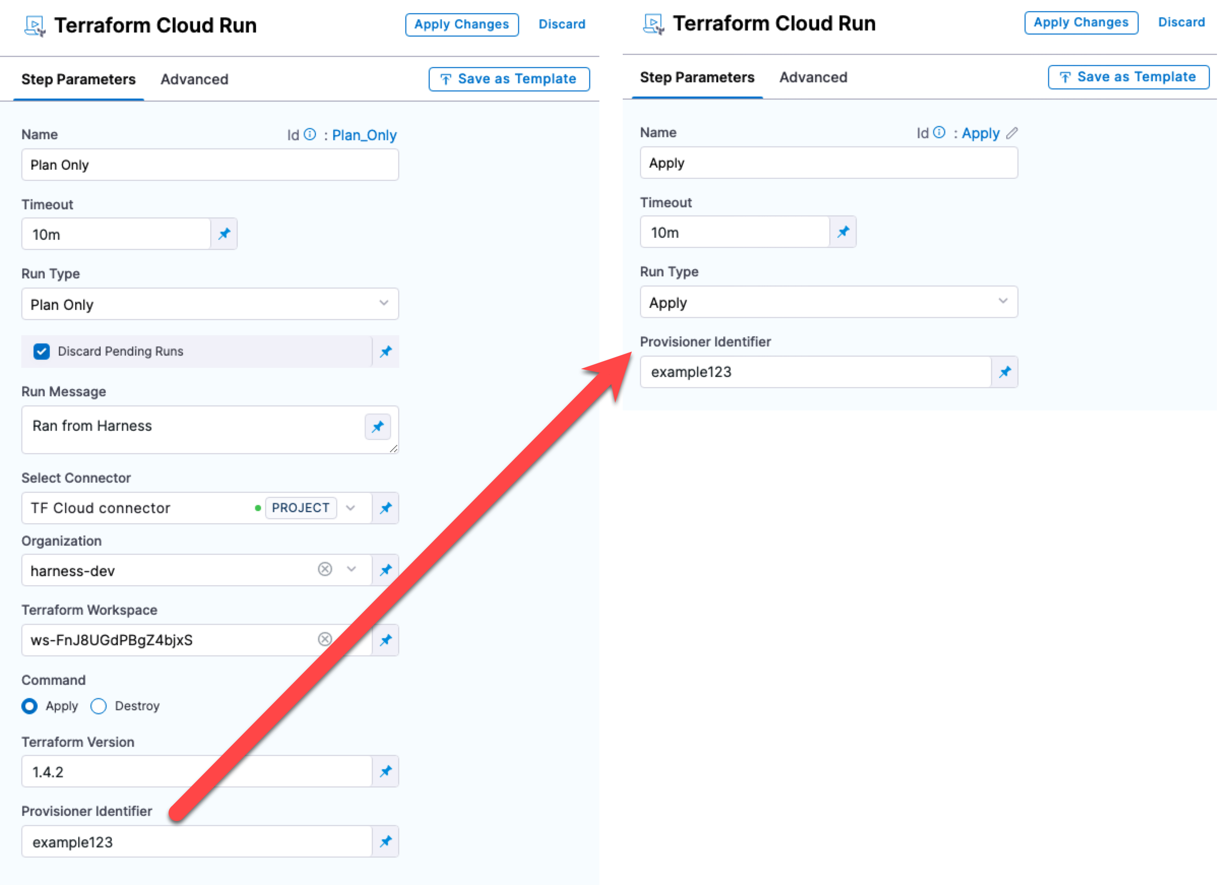 For the Terraform Cloud Run Apply run type to apply the provisioning from the Terraform Cloud Run Plan run type, you use the same Provisioner Identifier in both steps.