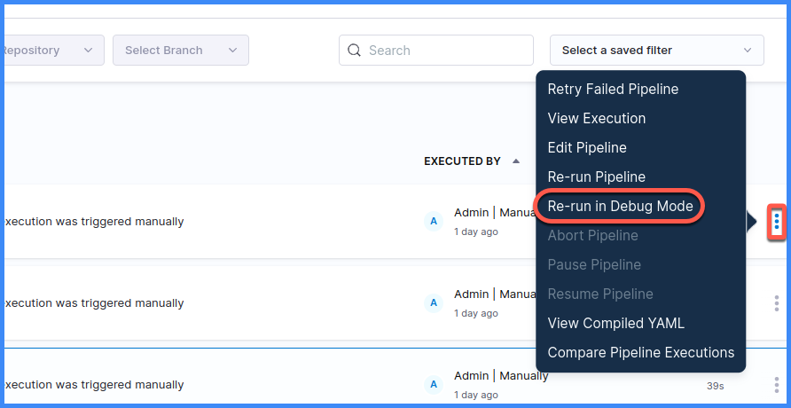 Locate the build you want to troubleshoot, select More Options (⋮), and select Re-run in Debug Mode.