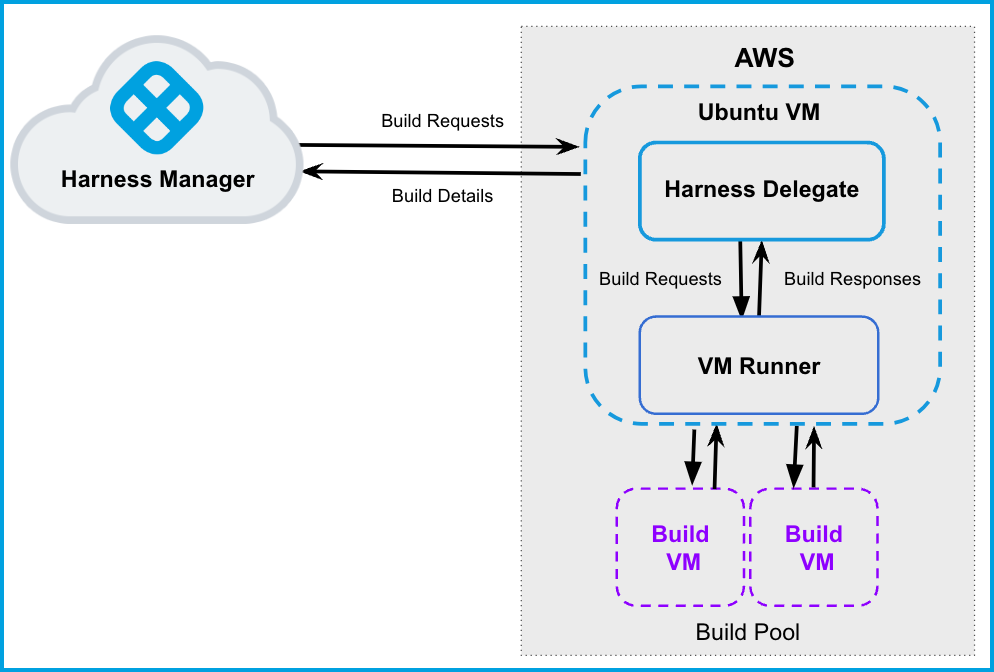 The following diagram illustrates a CI build farm using AWS VMs. The Harness Delegate communicates directly with your Harness instance. The VM runner maintains a pool of VMs for running builds. When the delegate receives a build request, it forwards the request to the runner, which runs the build on an available VM.