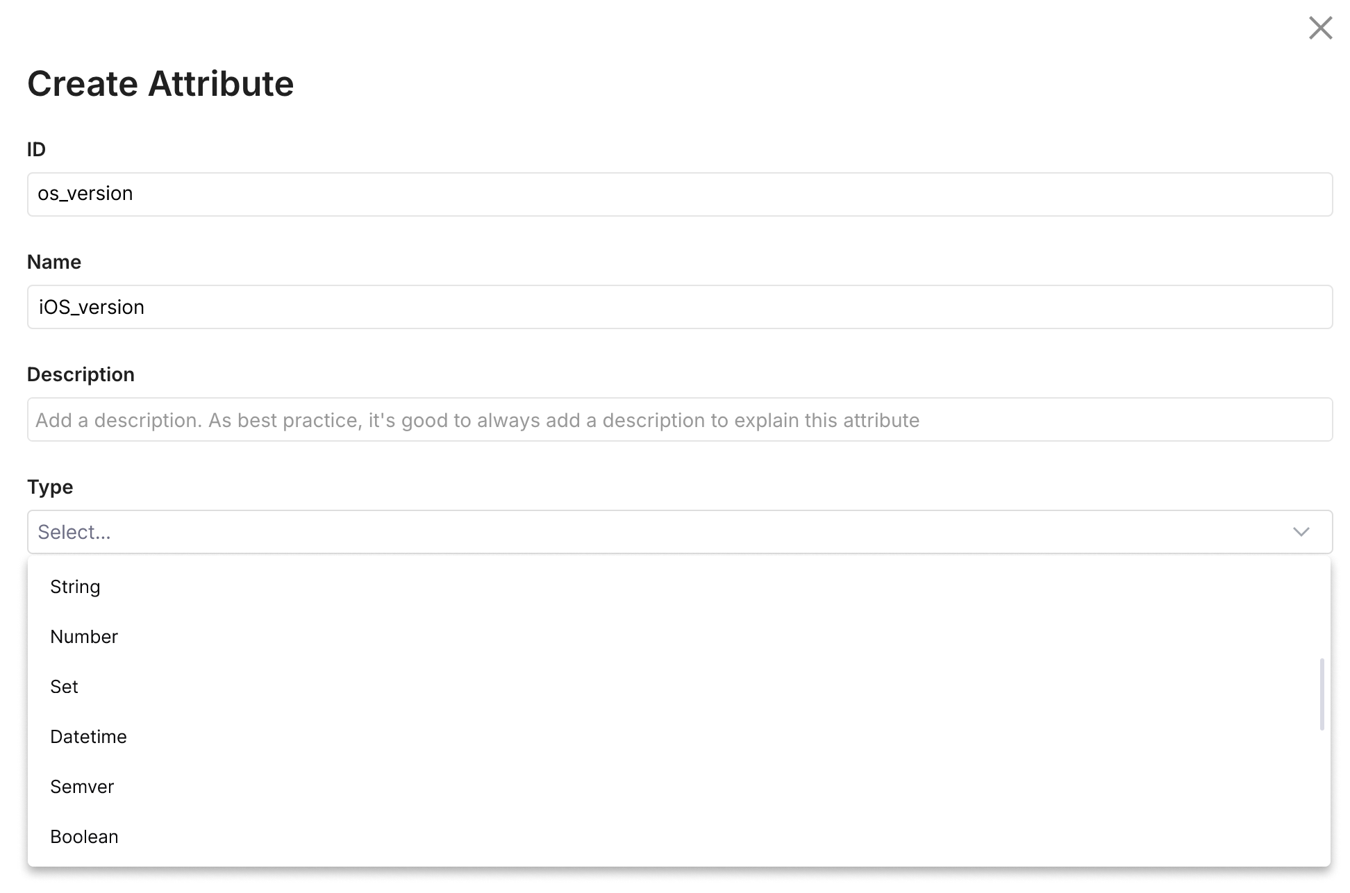 8. In the Type dropdown, select an attribute value type (e.g., String to represent text values, Boolean to represent true or false values, etc.).