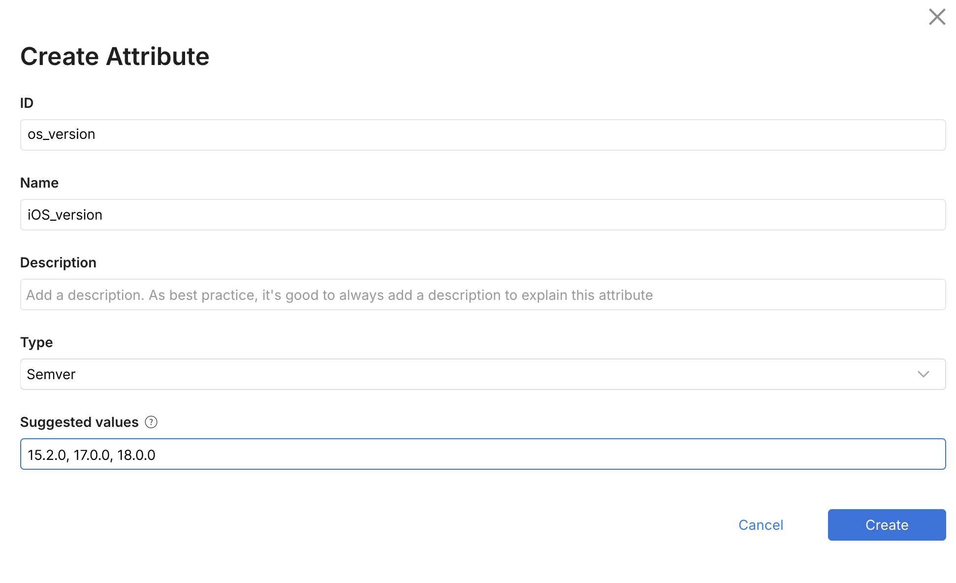 For example, use an attribute 'os_version' of type SemVer to give users that have a compatible OS version, e.g. >= 2.2.0, access to a new feature, while keeping the feature off for earlier OS versions.