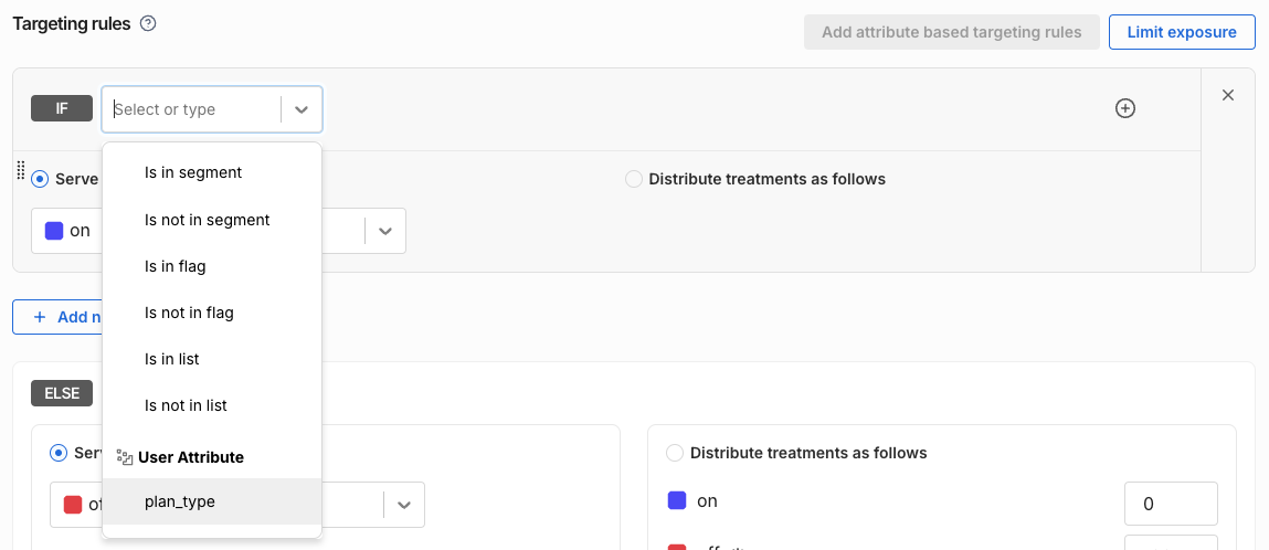 This article refers to the IF dropdown menu in a feature flag’s attribute based targeting rules as having the labels User and User Attributes, but these labels vary based on the traffic type chosen for the feature flag. For example, if a traffic type is exists in your project named ‘account’ and you select this traffic type when creating a new feature flag, then the IF dropdown menu in Harness would show Account and Account Attributes section labels.