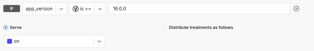 Serve the on treatment for users with custom attribute app_version greater than or equal to 16.0.0: