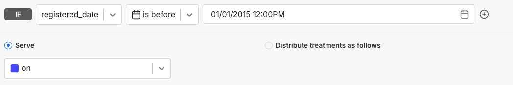 Serve the on treatment for users with custom attribute registered_date on or after a specified date: