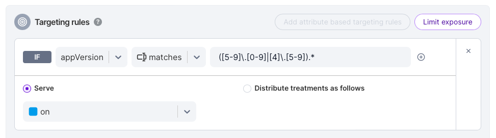 You can use the matches operator in the targeting rule editor within the Split user interface to match the value of a passed attribute (such as an app version) to a regular expression and specify treatment assignments for any versions that match the expression.