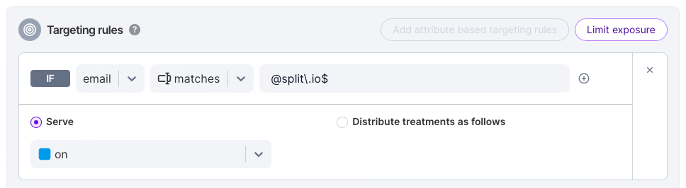 For this example, to serve the on treatment for all employees of split.io, we can use the Regex below for email attribute: