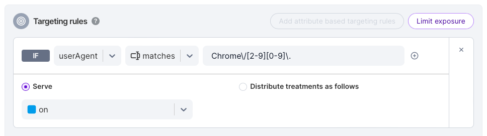 This example we are serving the on treatment to Chrome users only. However, we want to only use Chrome versions 20 and later for compatibility reasons. The attribute passed is userAgent: