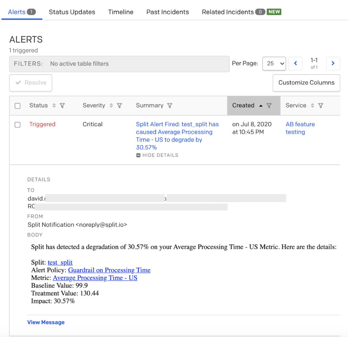 If the integration is configured properly, a new alert email from Harness FME appears as incidents in PagerDuty, per your rules configuration.