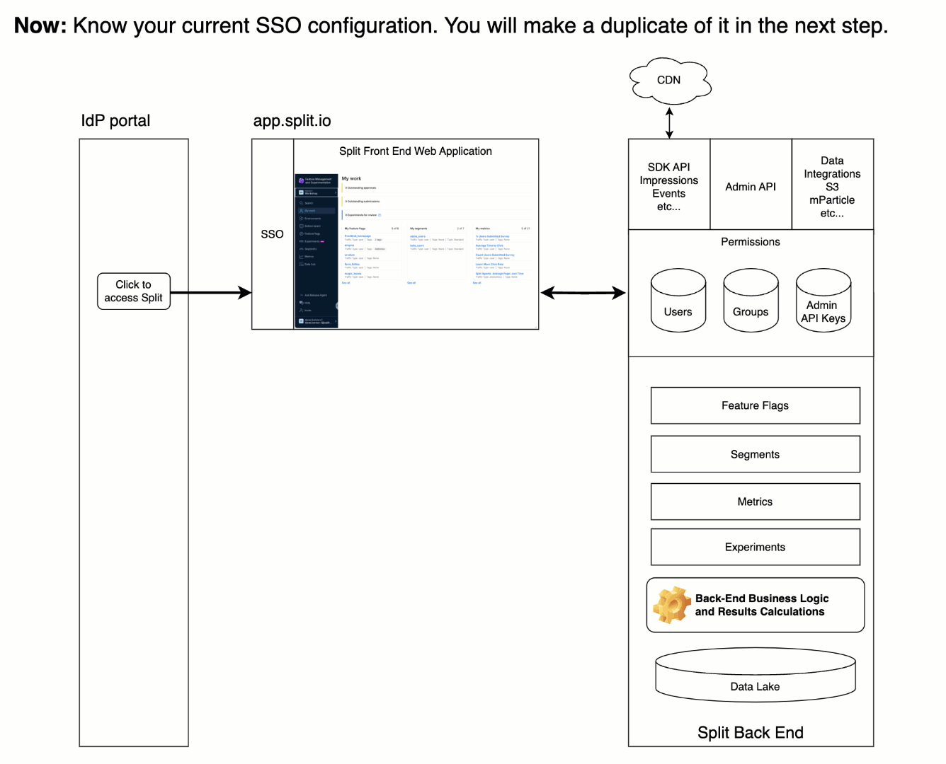 • To preserve the instant revert capability seen in the animation above, do not disable your SSO configuration to app.split.io at the moment of migration. Users who attempt to use the app.split.io SSO after migration will be shown a message pointing them to app.harness.io, so it's OK to leave both SSO configurations active for some time.