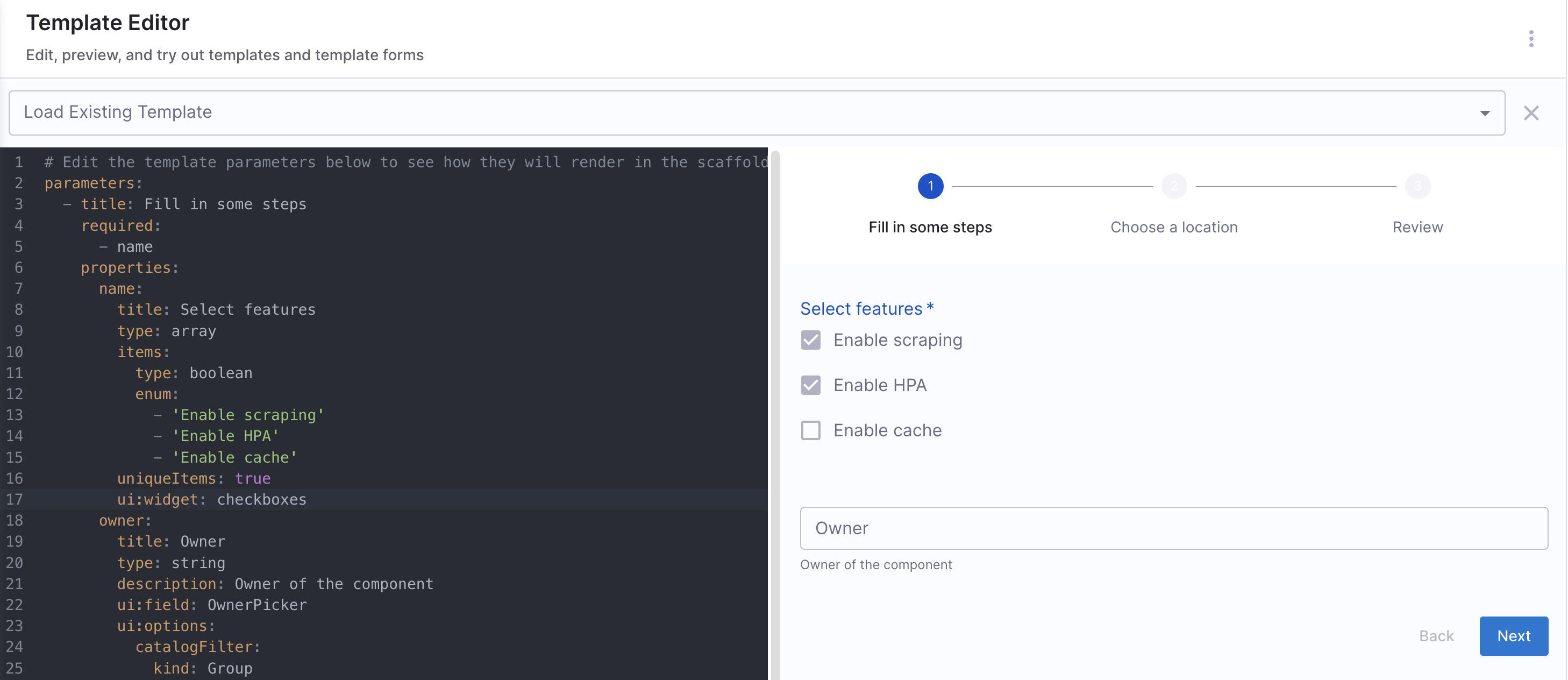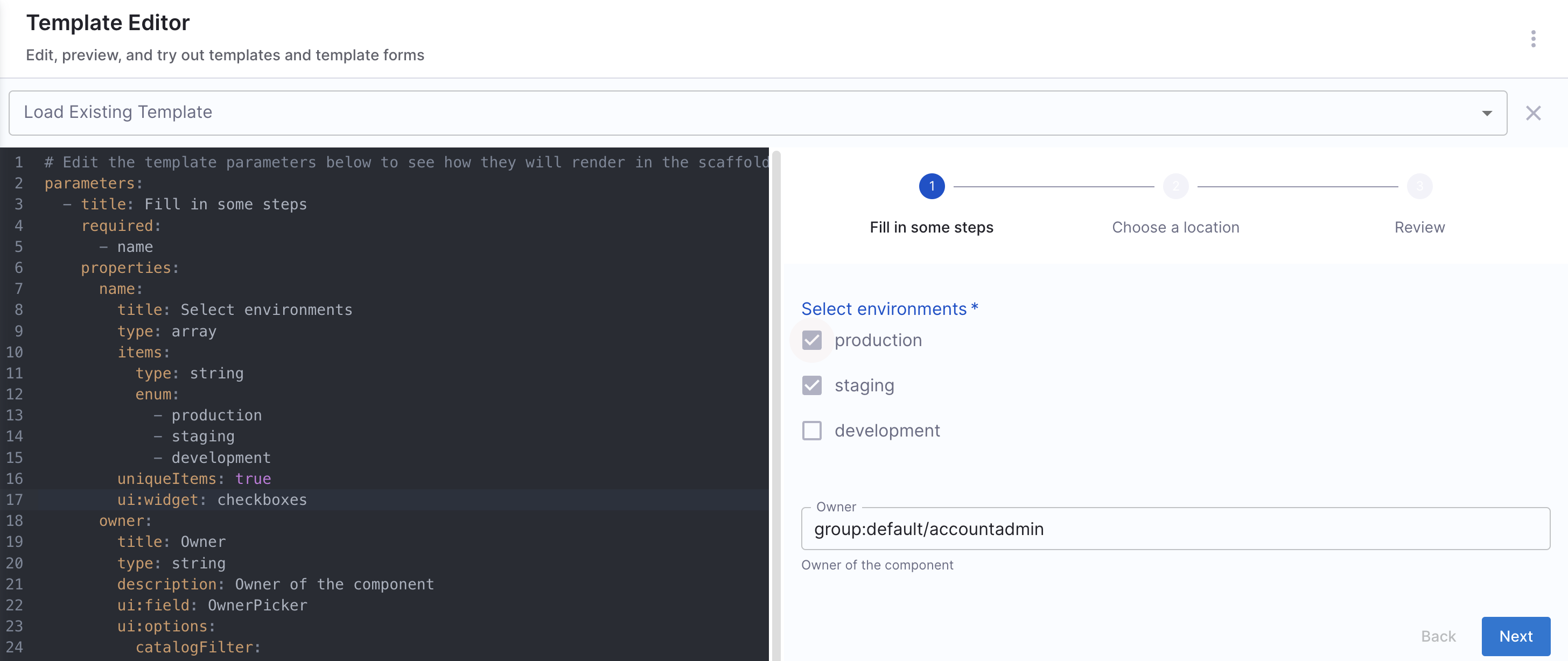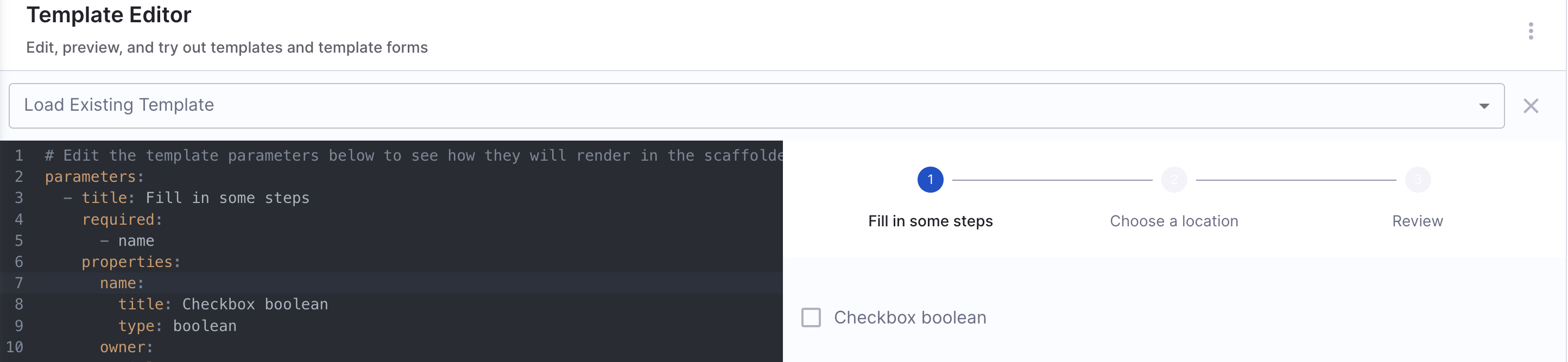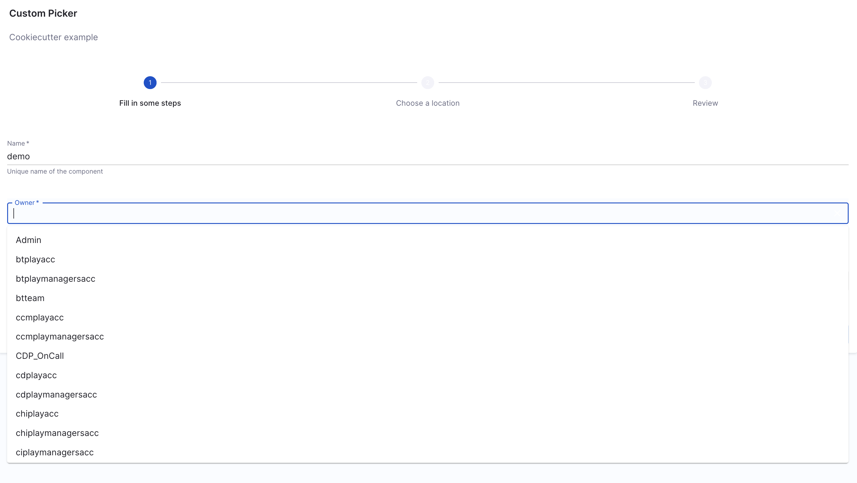 Entity Picker– Select an entity from the catalogOwner Picker– Select a user or groupRepository Picker– Choose a repository from a version control provider