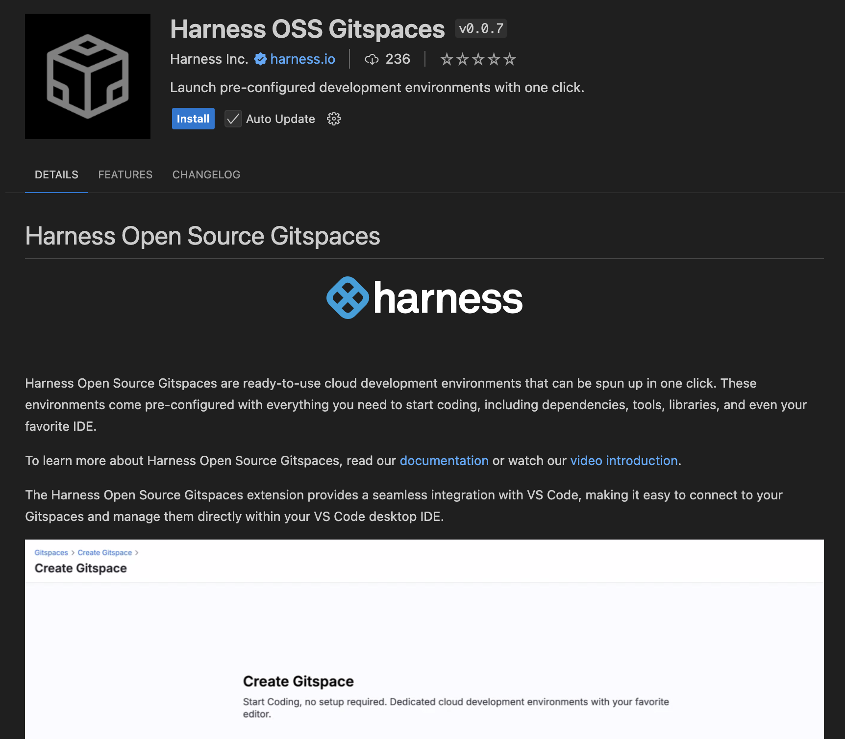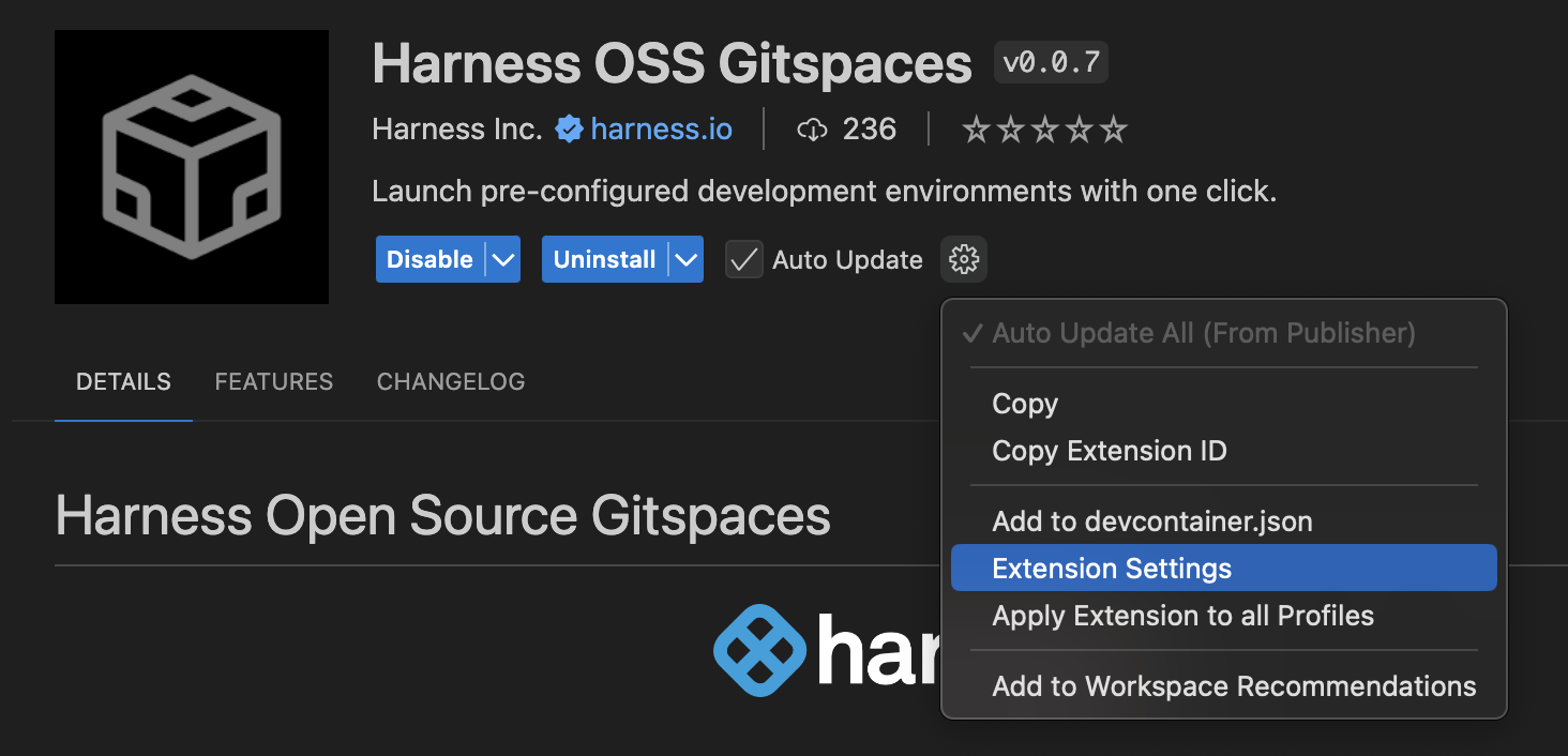 Search for “Harness Open Source Gitspaces Extension”.