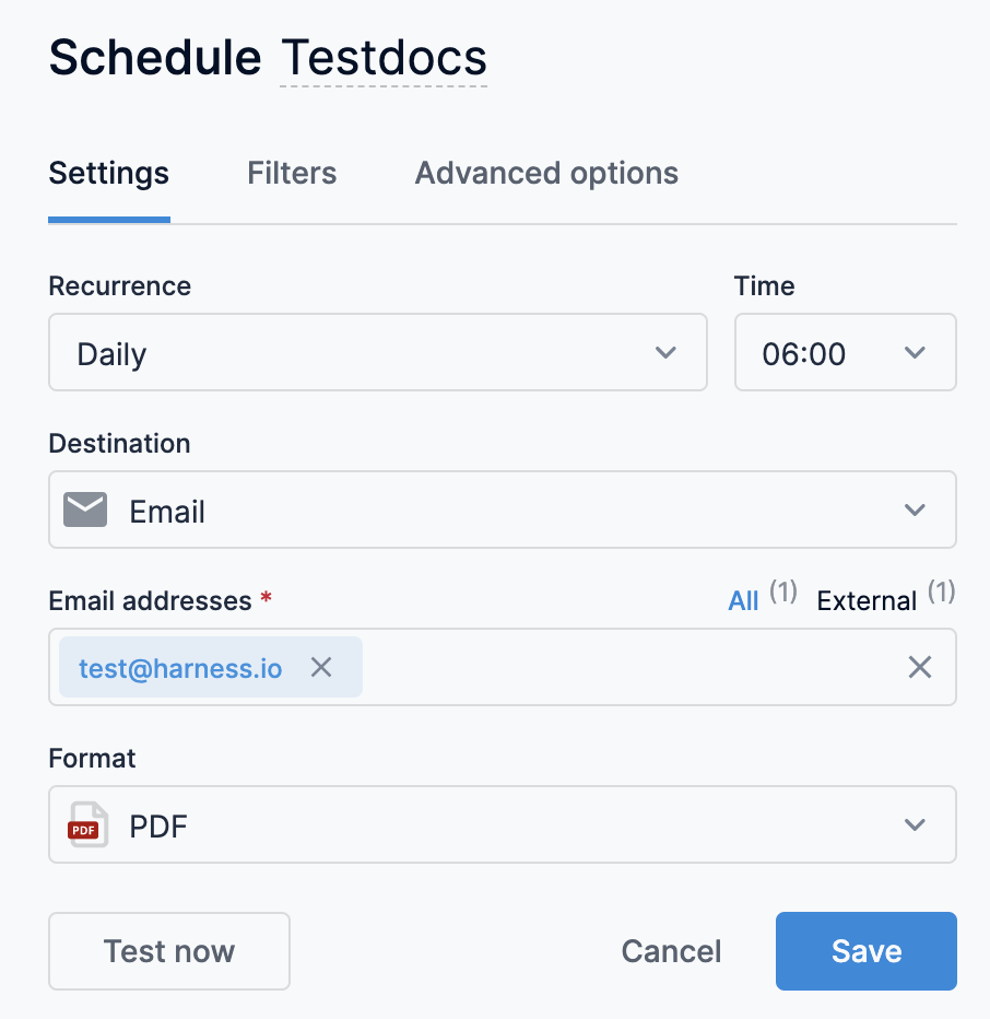 The settings tab allows you to customize your delivery’s recurrence, destination, format, and more.