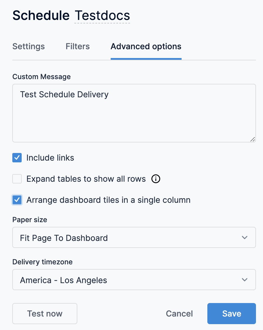 • PDF: An image of the dashboard as a single PDF file. The default layout displays tiles as they are arranged in the dashboard, but other layout and sizing options are available under Advanced options. For deliveries to email, the file is delivered as an email attachment.