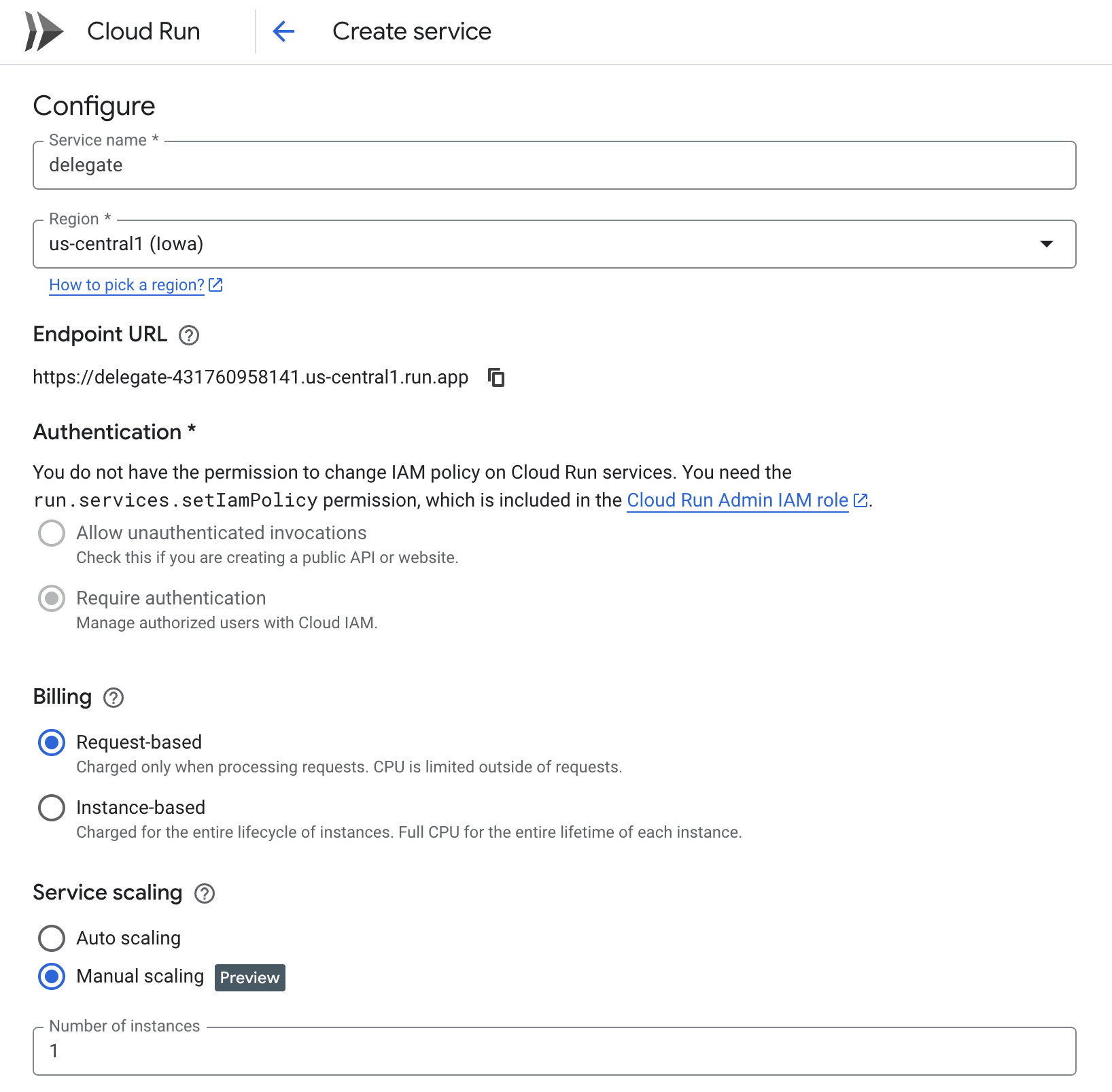 For now, we will opt for Manual Scaling and set the number of instances to 1.