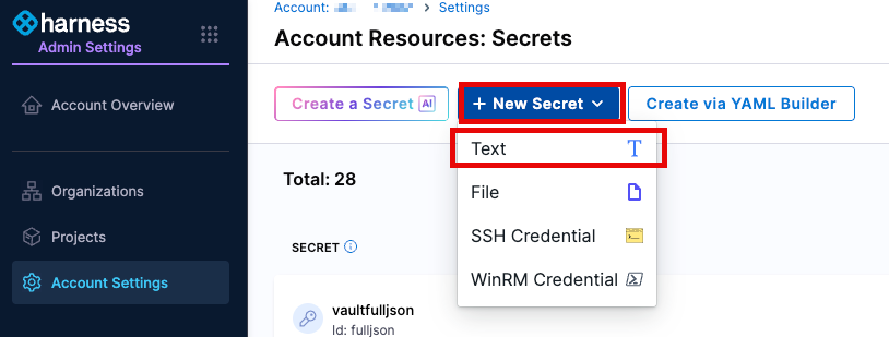 7. Refer to the secret by its location and ID <+secrets.getValue("account.secretname")>