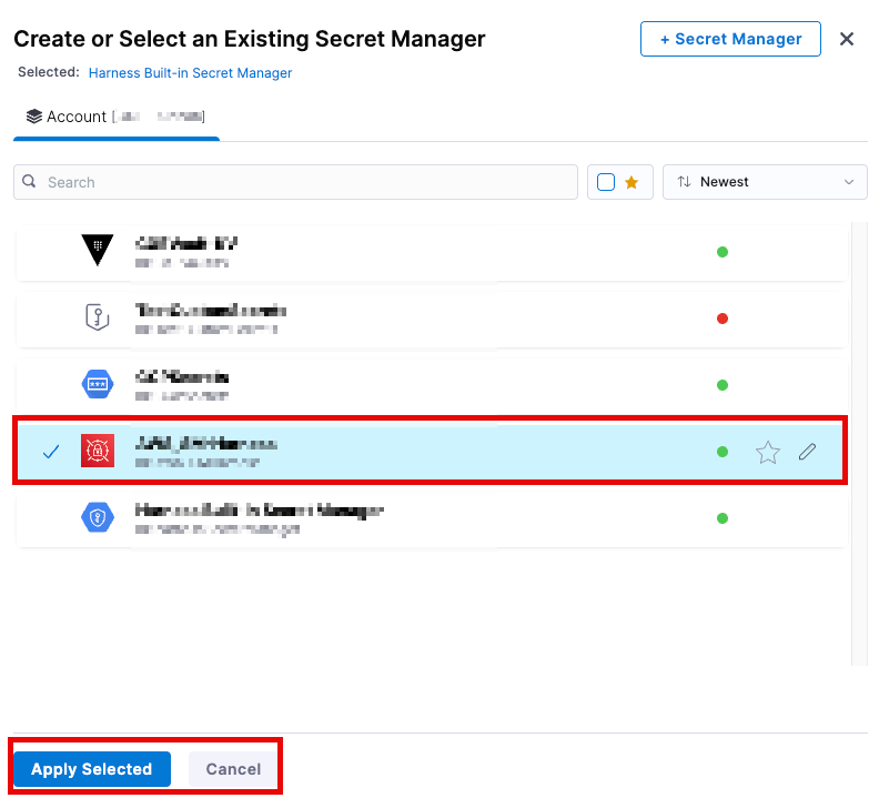 3. Change the secrets manager to the AWS Manager that has been created already. (This should be residing in AWSAccountEast in our example) and click `Apply Selected