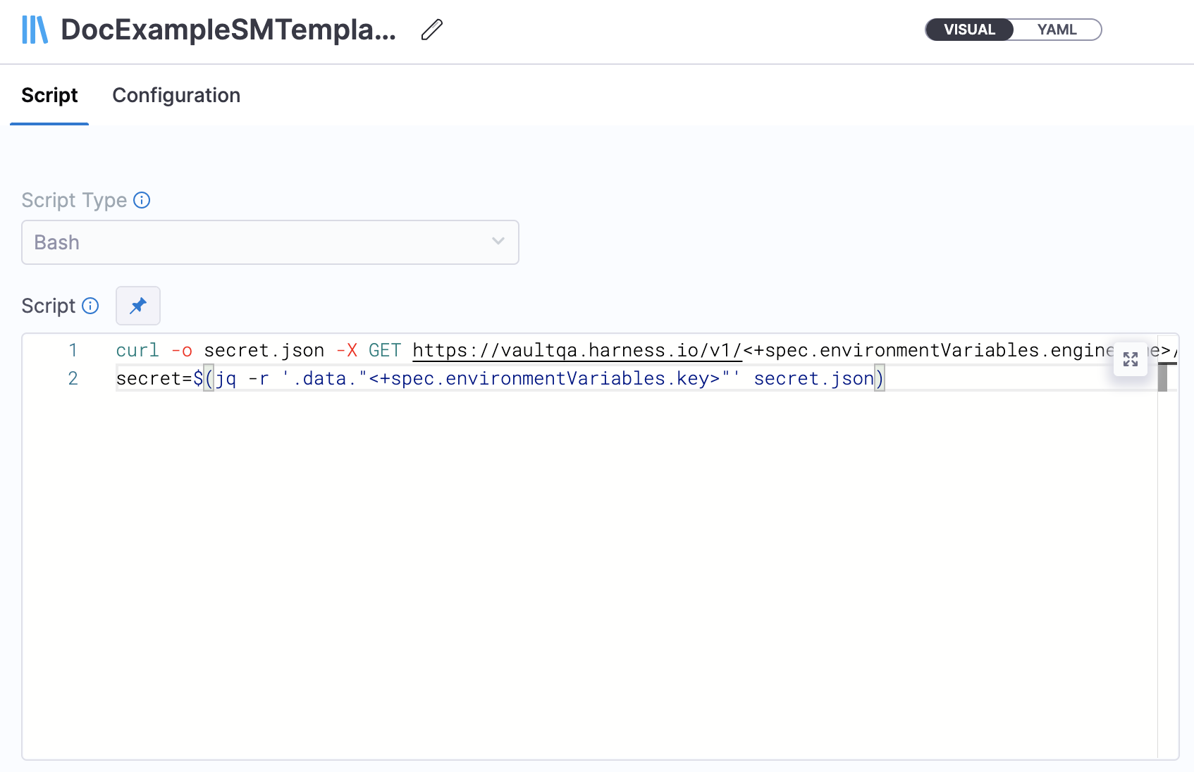 curl -o secret.json -X GET https://vaultqa.harness.io/v1/<+spec.environmentVariables.engineName>/<+spec.environmentVariables.path> -H 'X-Vault-Token: <+secrets.getValue("vaultTokenOne")>'