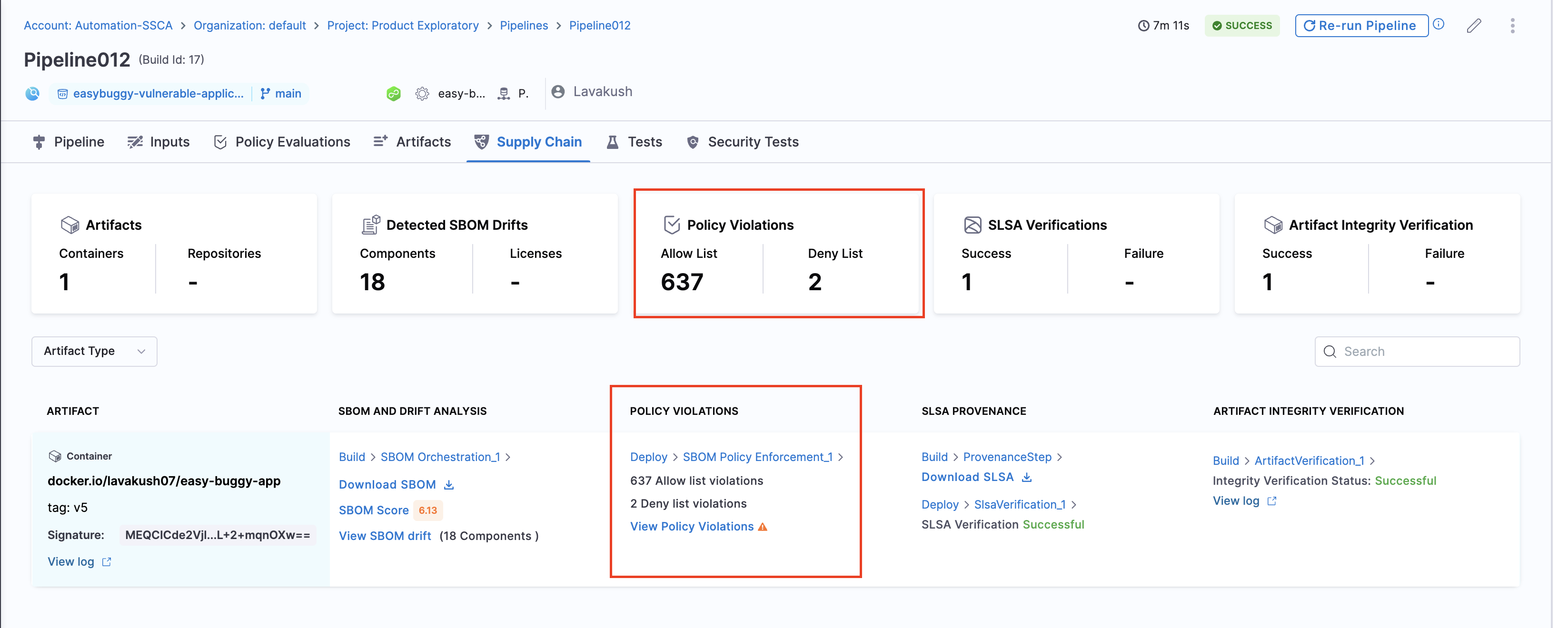 The policy violations arising from the SBOM Policy Enforcement step in your pipeline are accessible under the "Policy Violations" section of the artifact list. Also, the Policy Violations card in the overview displays a cumulative count of all the allow list and deny list items across all artifacts.